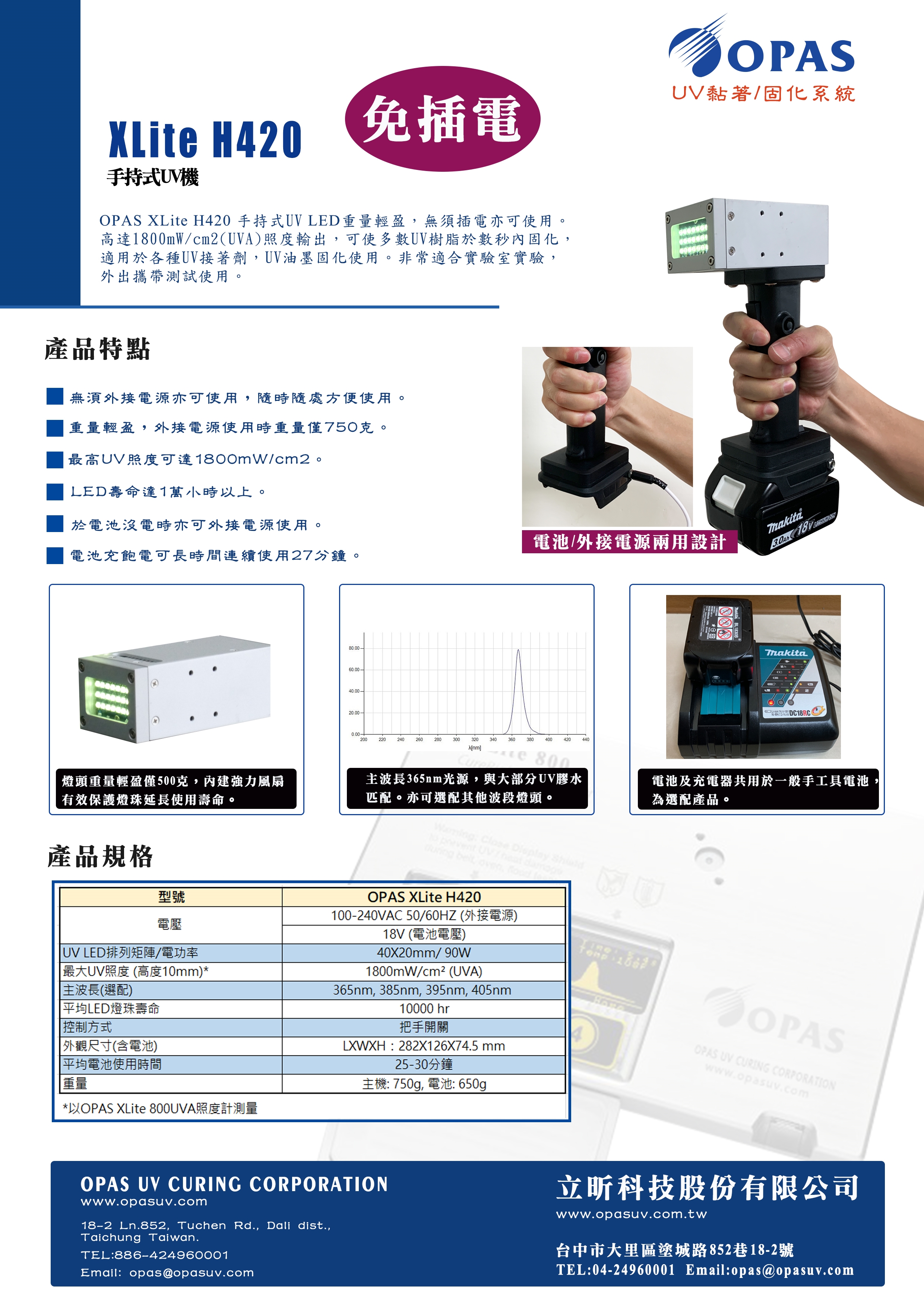 OPAS XLite H420 手持式UV LED重量輕盈,無須插電亦可使用。 高達1600mW/cm2(UVA)照度輸出,可使多數UV樹脂於數秒內固化, 適用於各種UV接著劑,UV油墨固化使用。H420非常適合實驗室及外出攜帶使用。